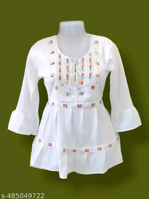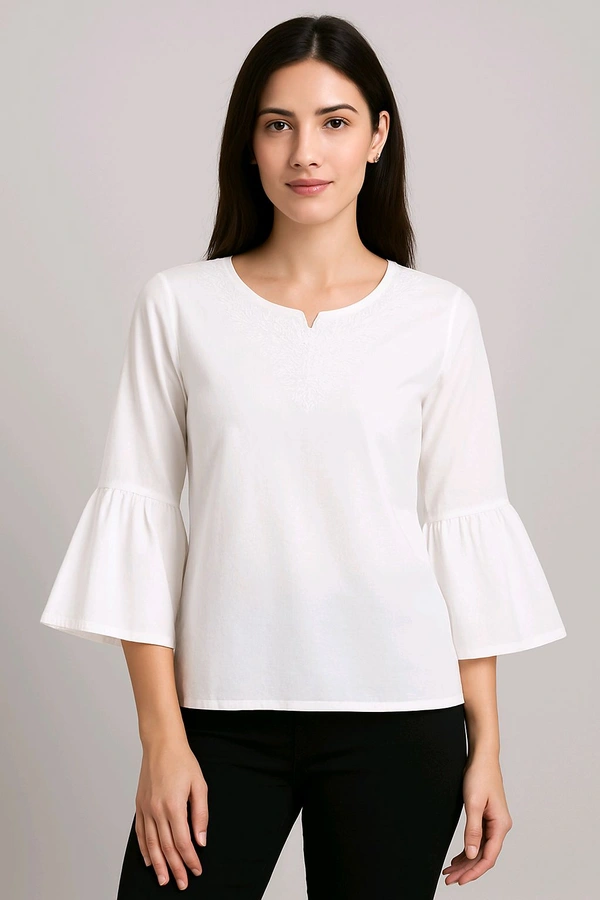 CloudBella™ White Cotton-Blend Bell Sleeve Top – Embroidered, Round Neck Casual & Partywear for Women & Girls (XS–XXL)